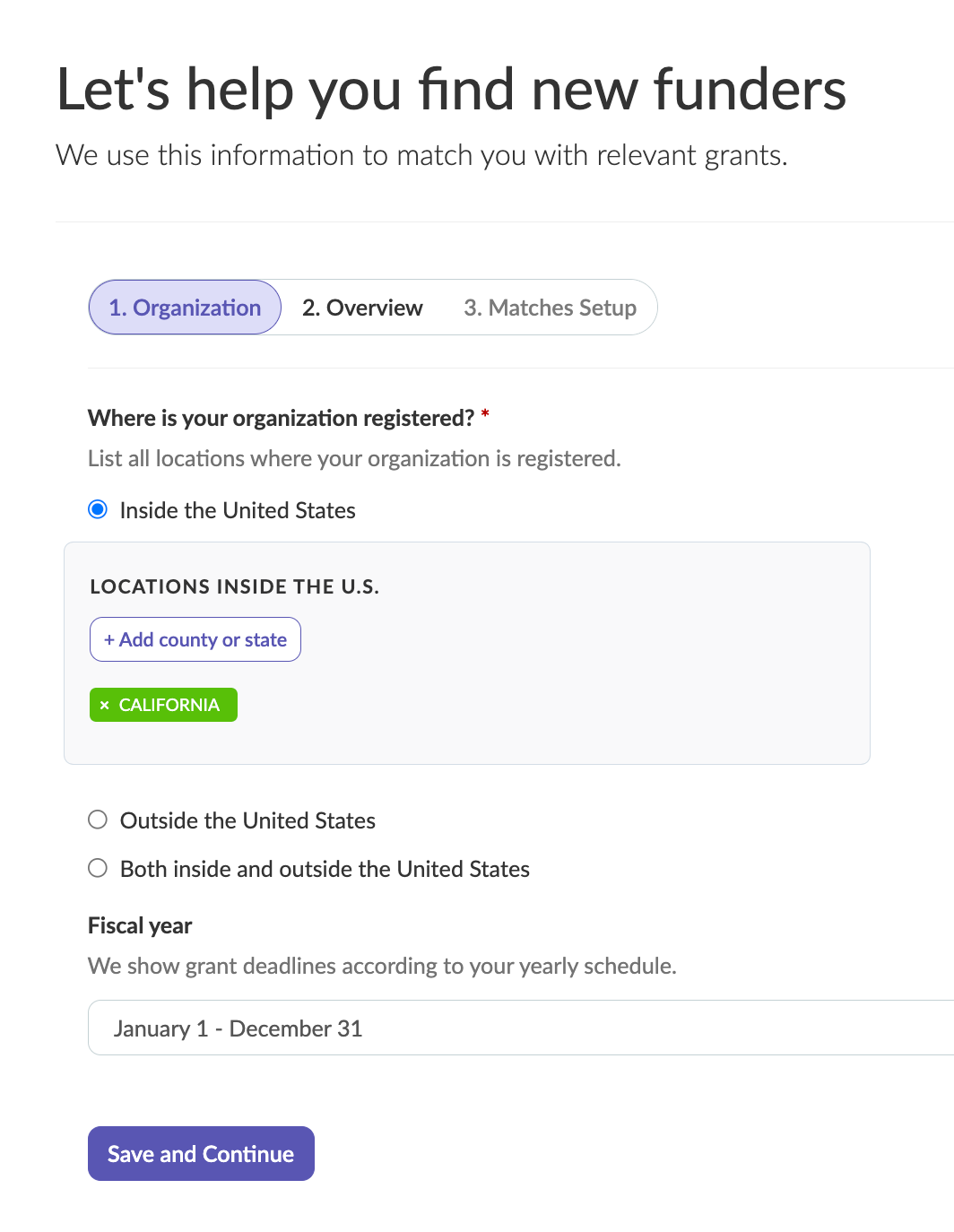 Step 1: Tell us about your organization’s location and choose your fiscal year.