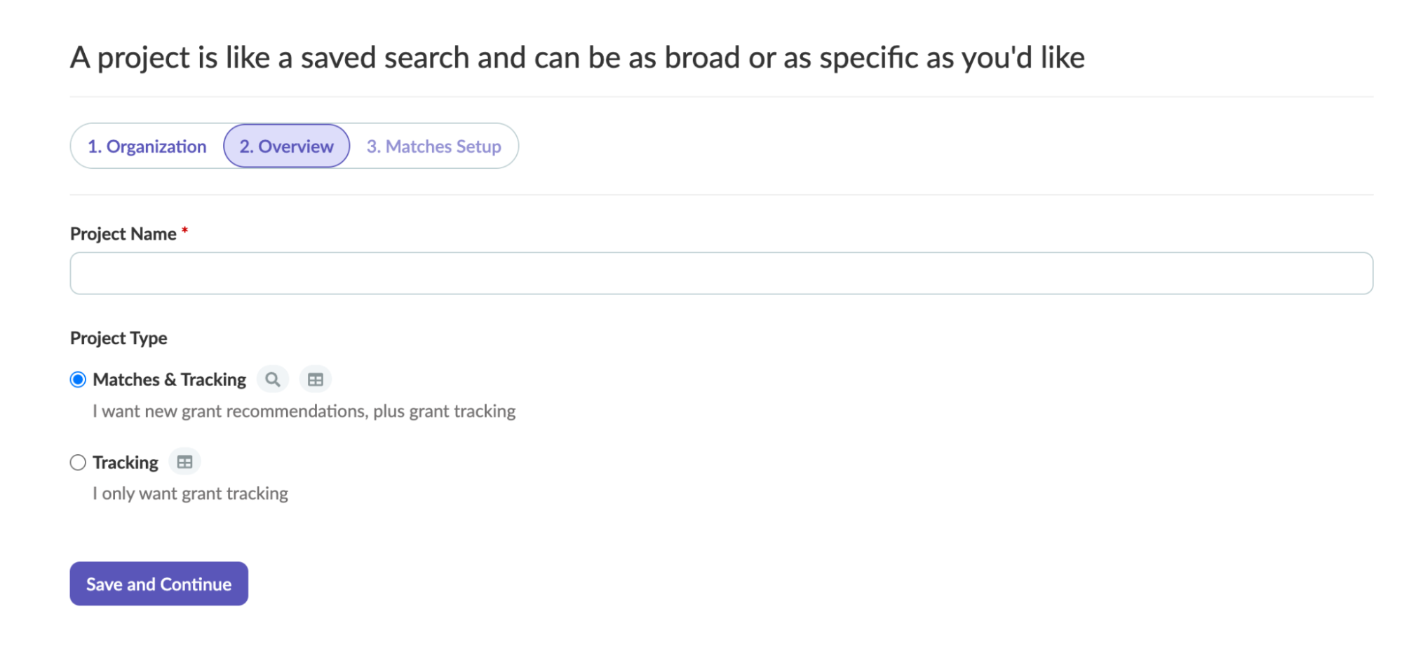 Step 2: Name your project and decide how you’d like to use Instrumentl. Some organizations need only grant tracking features while others want to discover new funding opportunities as well.
