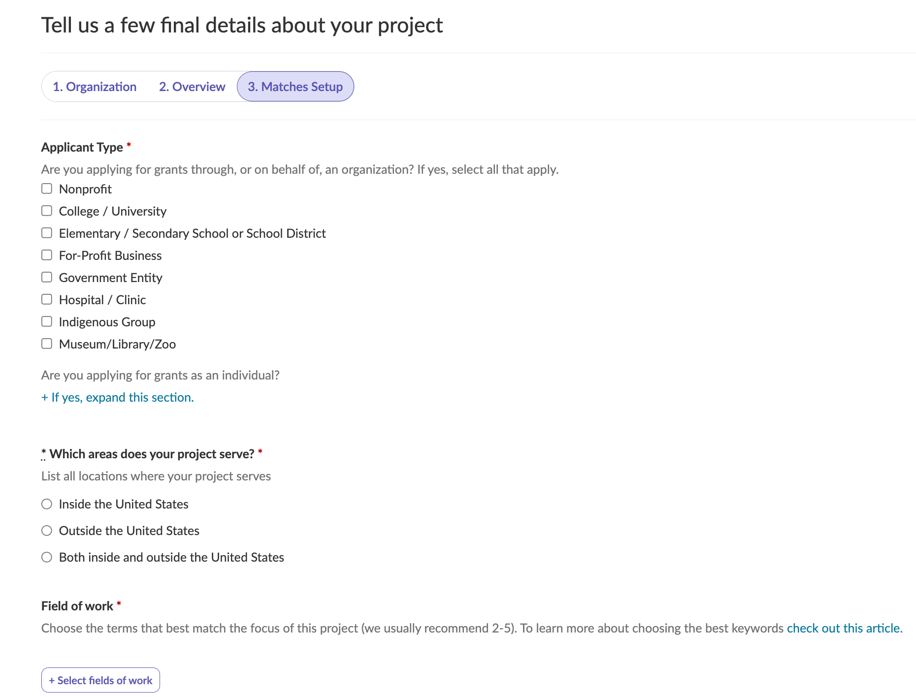 This third step is crucial for discovering good-fit funders for your organization. It’s where you’ll check your Applicant Type, geographical areas your project serves, and your fields of work.