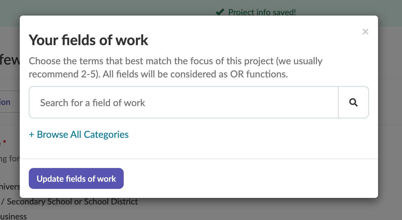 Step 4: Select relevant fields of work. You can search for the term and get suggestions, or you can browse all categories and find the ones that are suitable for your project.