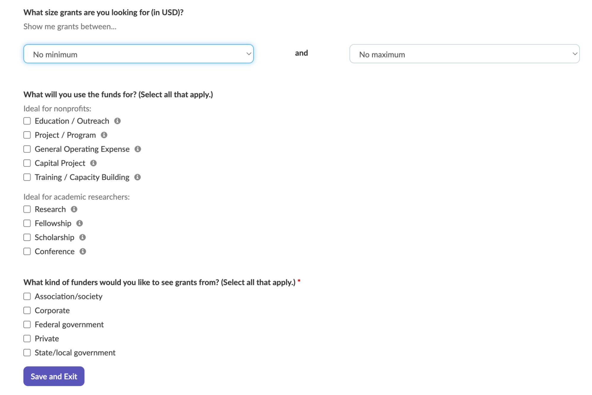 Step 5: Finish setting up your first project by selecting your desired grant size, use of funding, and the type of funders you’d like to get grants from. When you’re done, just click on “Save and Exit”.