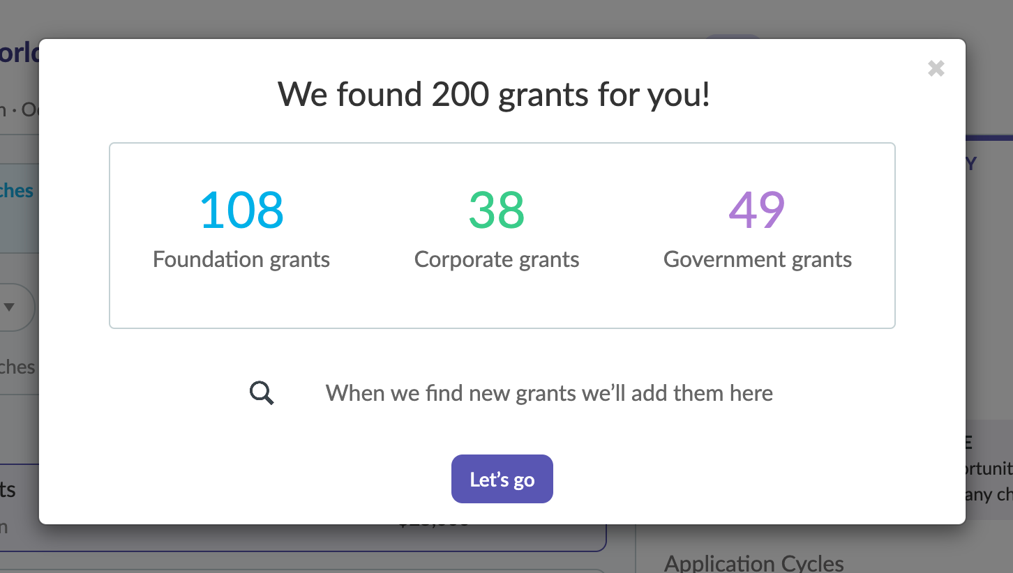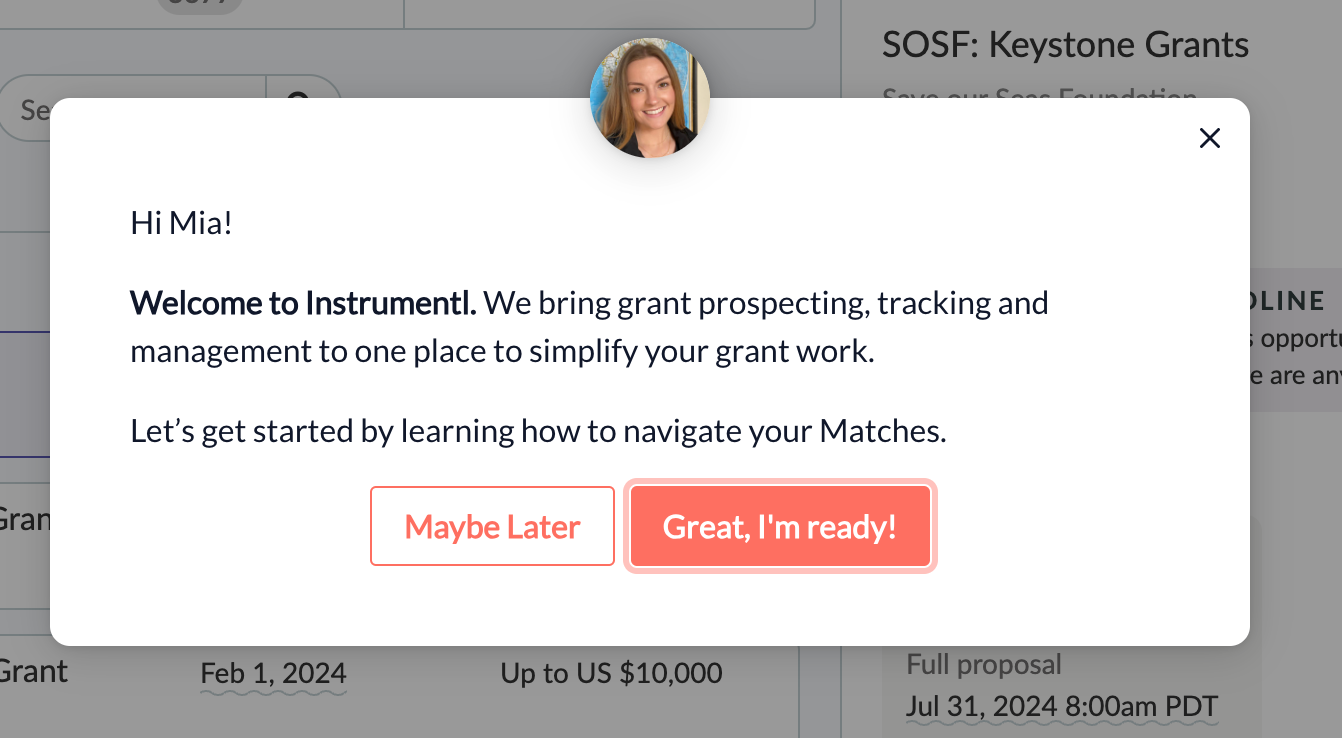 Step 7: Enjoy the fact that Instrumentl found hundreds of grant opportunities for you in seconds! Once you click on “Let’s go”, our lovely Becca from the Customer Success team will give you a quick tour of how Matches in Instrumentl work.