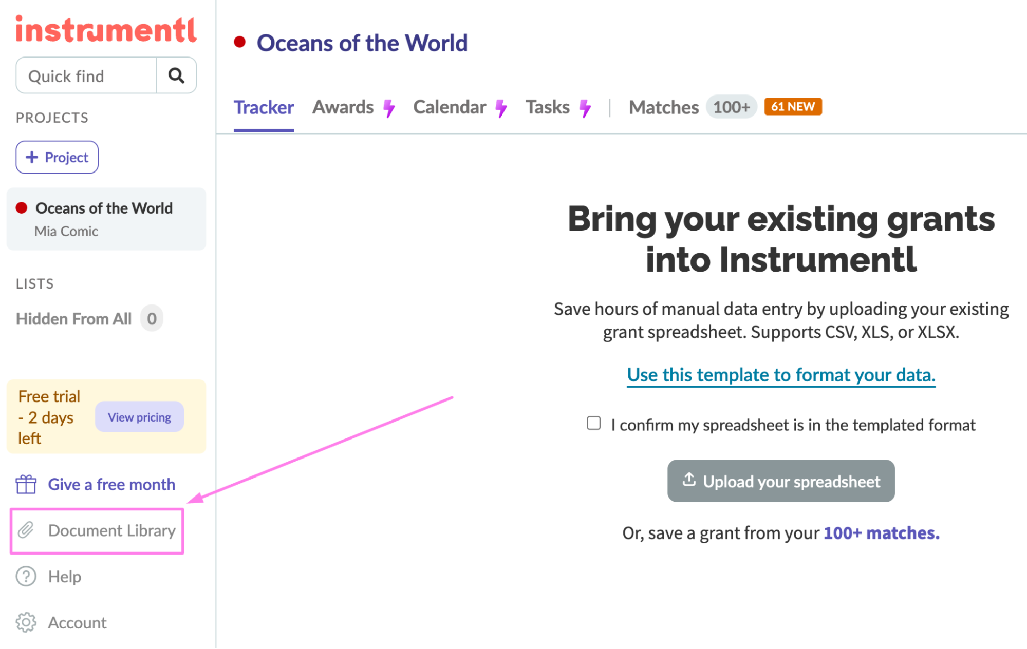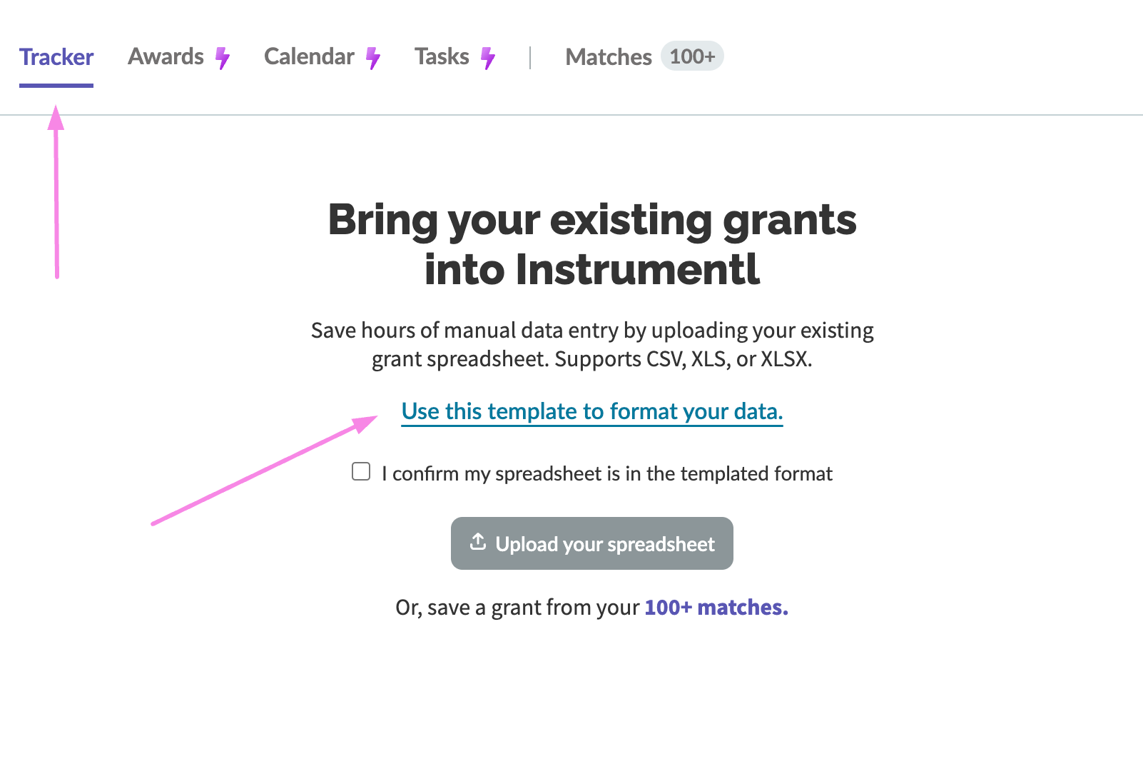 Step 1: Click on the “Tracker” to bring your historic grants to Instrumentl. Then explore the template you need to use to properly import your grant data