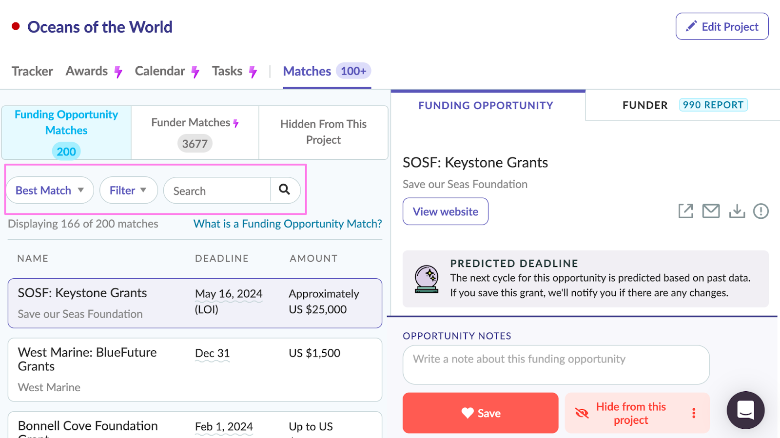You can sort your opportunities based on the Best Match (Instrumentl sorts results based on the info you shared during the project setup), deadline, amount, or recency (i.e. whether or not the opportunity has just been added to your matches).