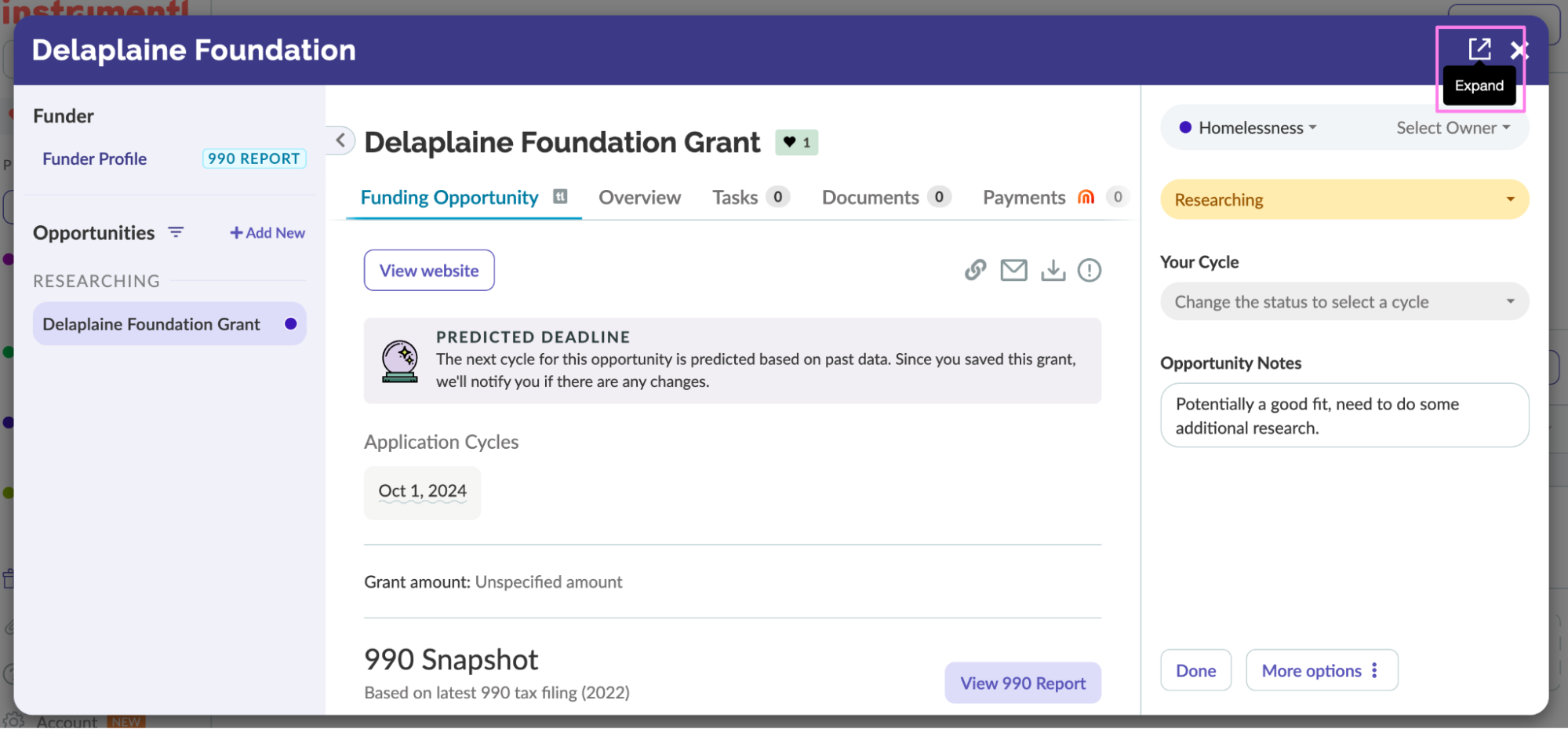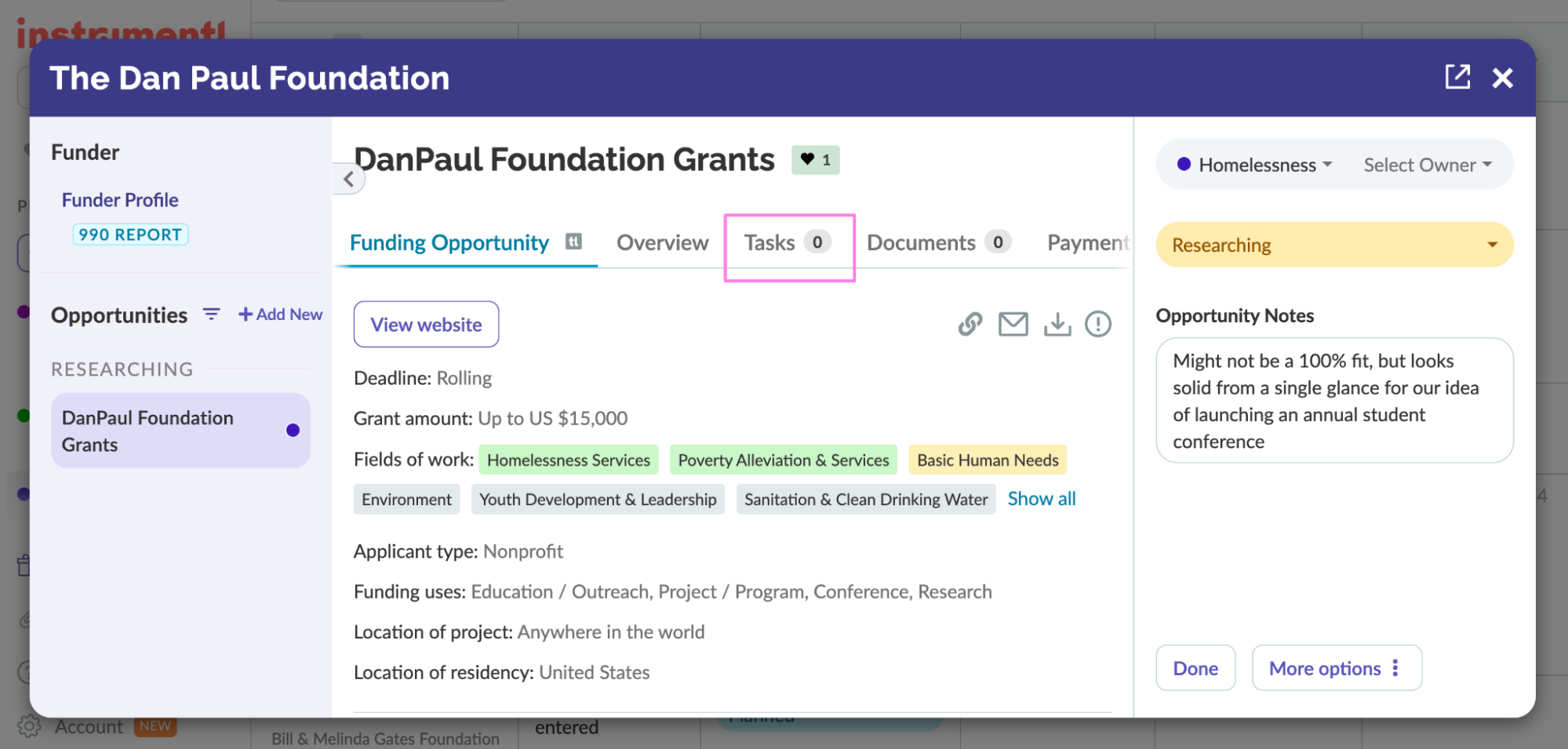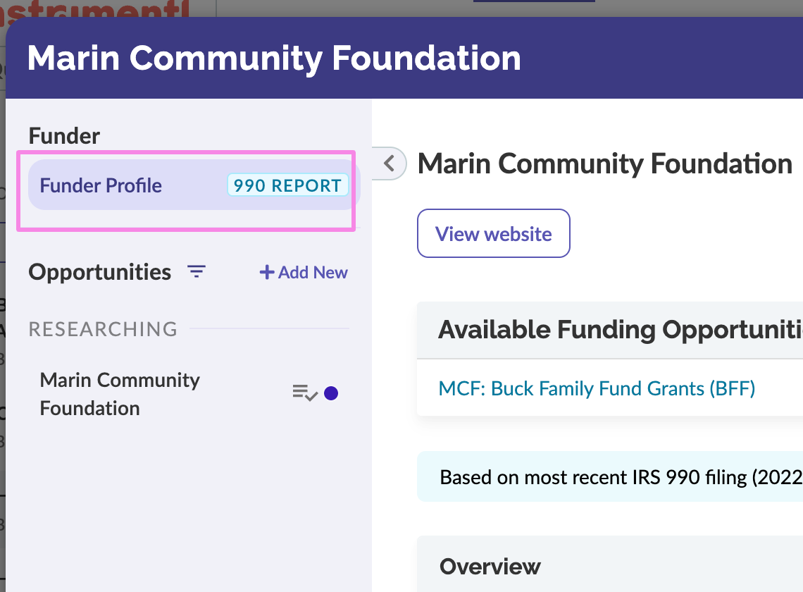 Instrumentl glossary: A Funding Opportunity Match on Instrumentl refers to a funding opportunity with public information on the funder's website that has an open way to apply or submit an LOI. Funding Opportunity Matches can be from foundation, corporate, or government sources. All information you see in Instrumentl comes directly from the funder's website.