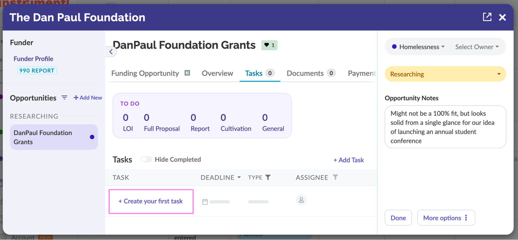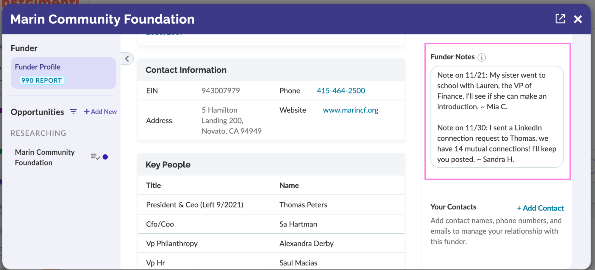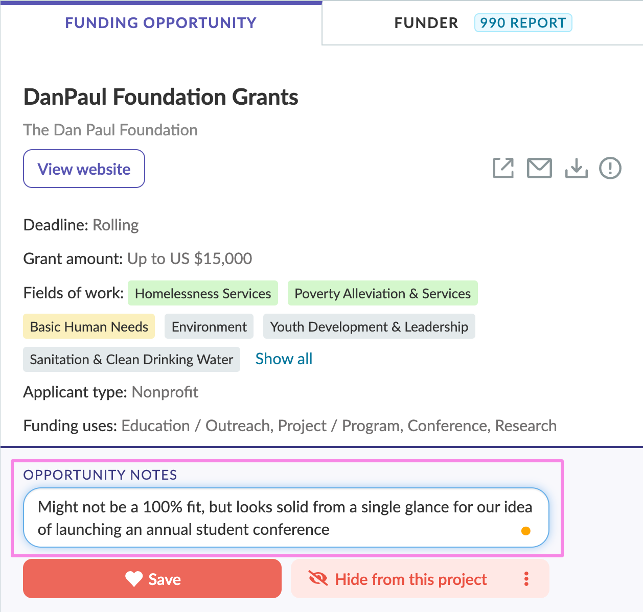 Instrumentl glossary: A Funding Opportunity Match on Instrumentl refers to a funding opportunity with public information on the funder's website that has an open way to apply or submit an LOI. Funding Opportunity Matches can be from foundation, corporate, or government sources. All information you see in Instrumentl comes directly from the funder's website.