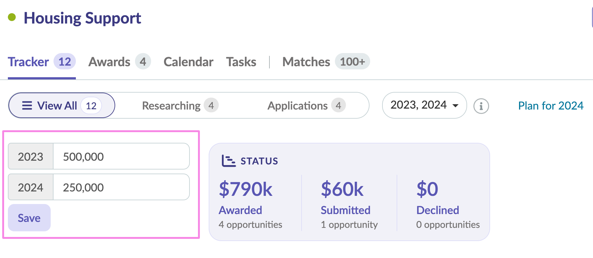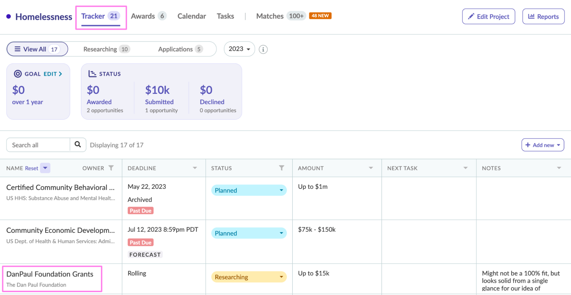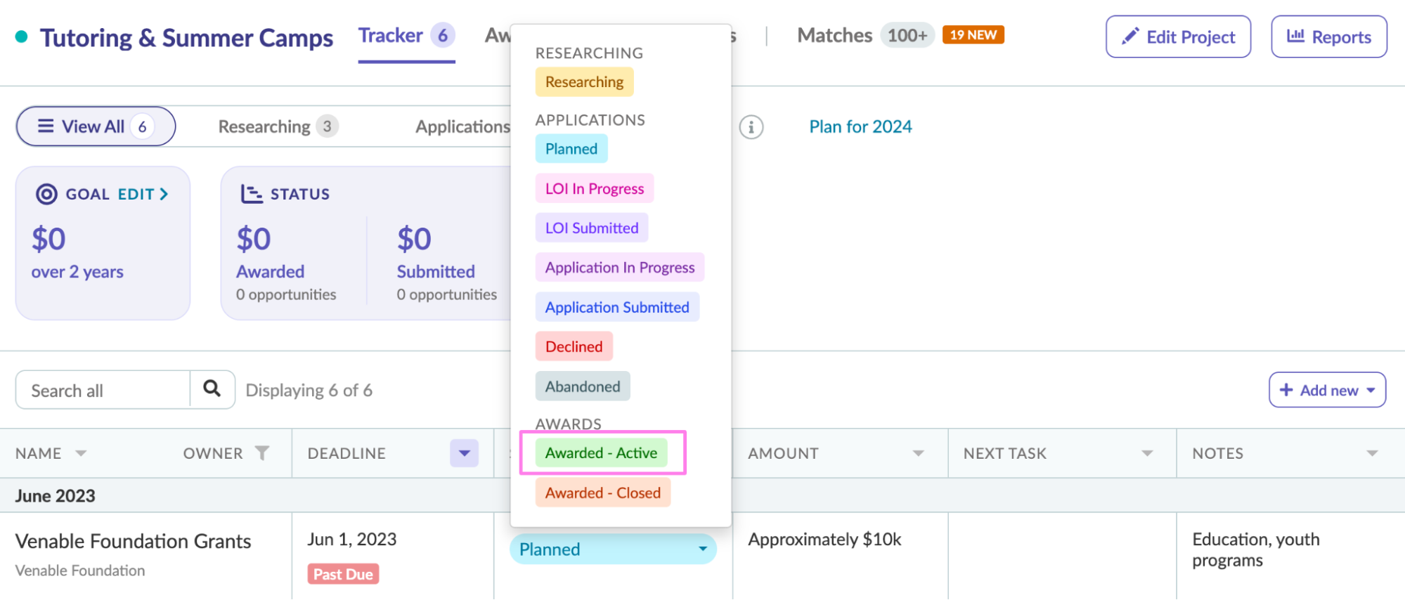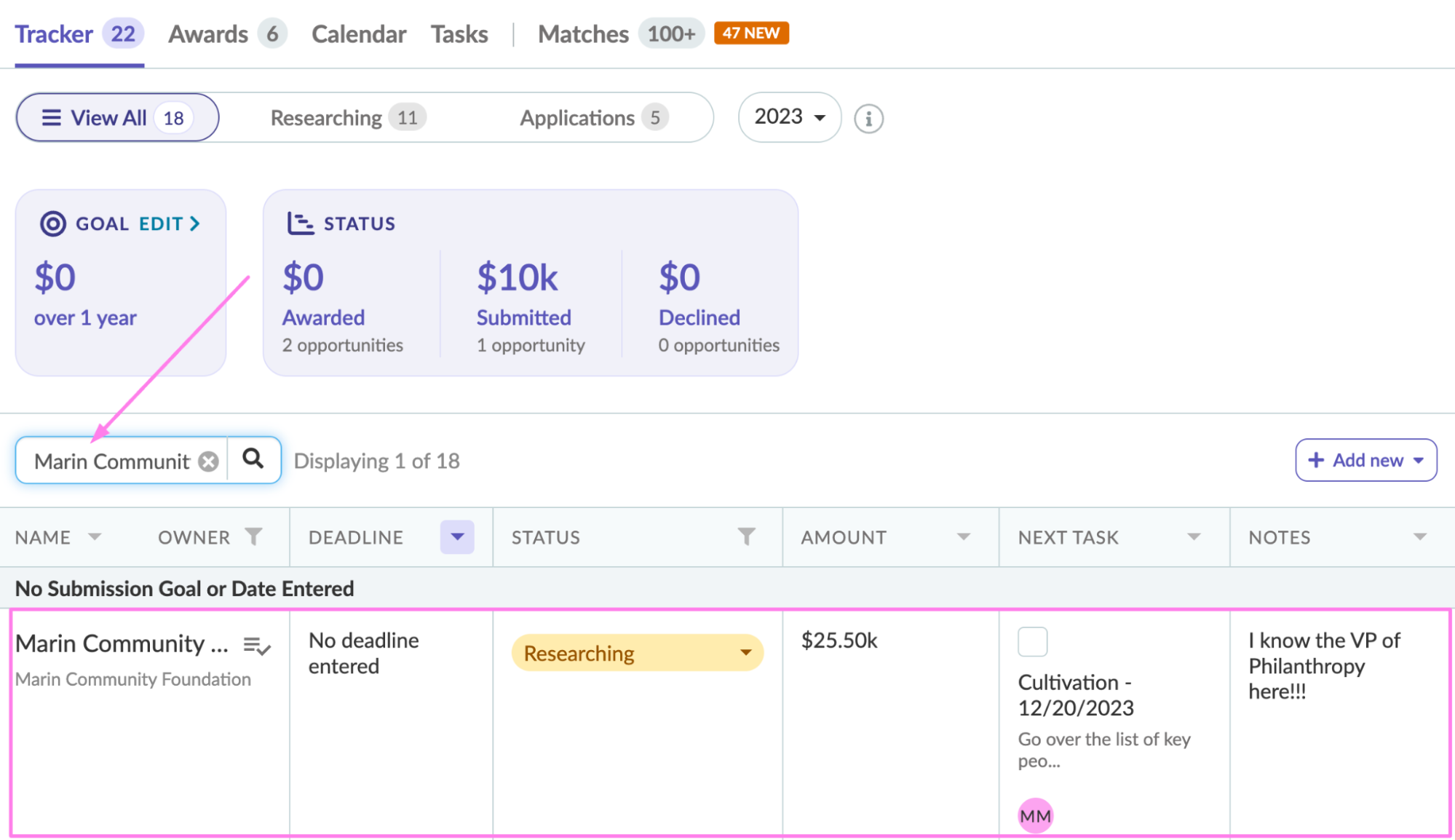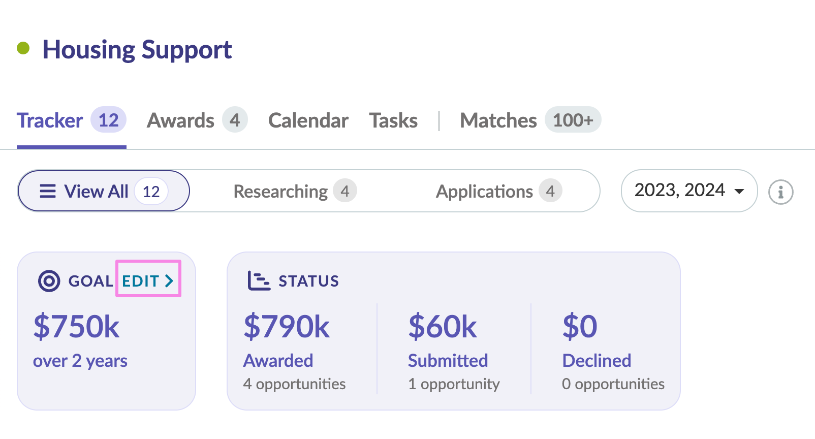 The Goal you set will be visible at all times at the top, whether you’re viewing it from the main Tracker view or through filtered views (opportunities that you’re researching or those that are currently in the application phase). This is how you can keep your eyes on the prize.