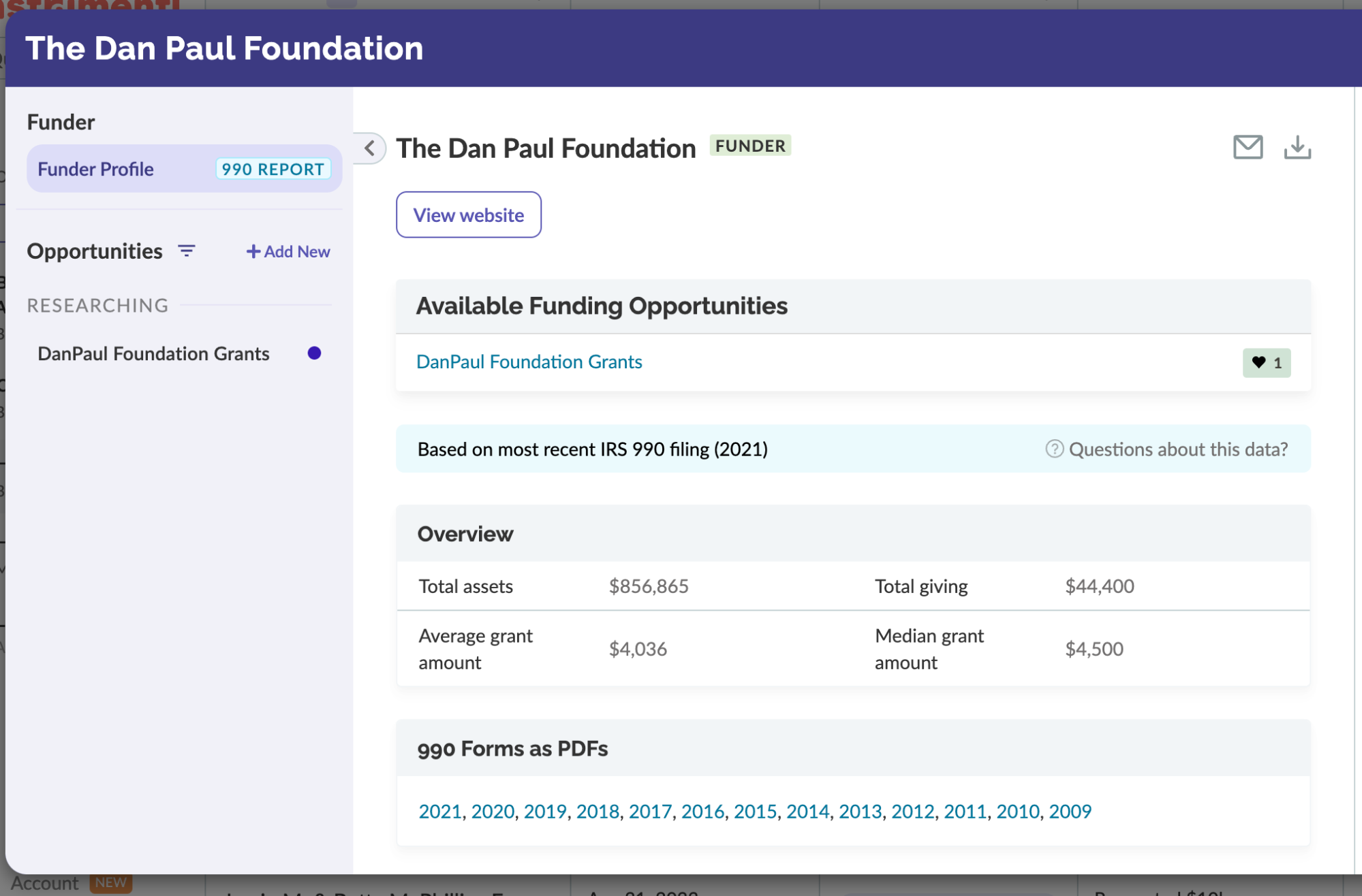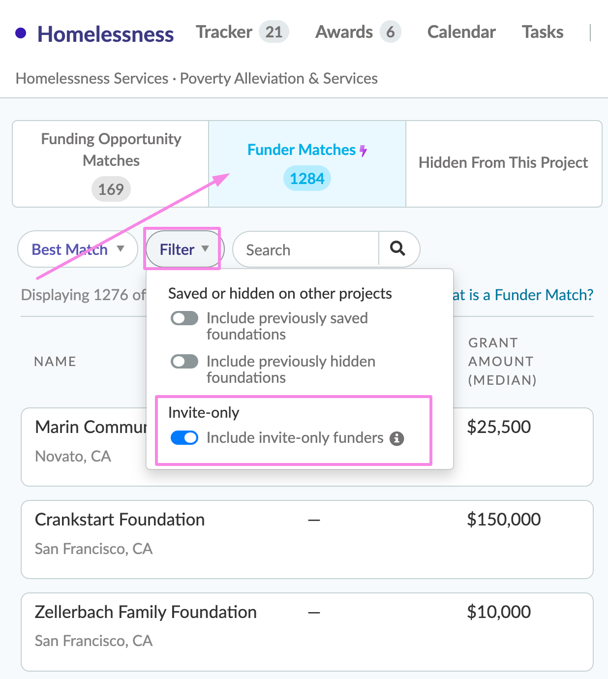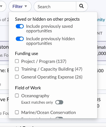 But what’s more likely to move the needle for you are the various types of filters Instrumentl has under the “Filter” drop-down. These will help you narrow down your matches and find best-fit funders.