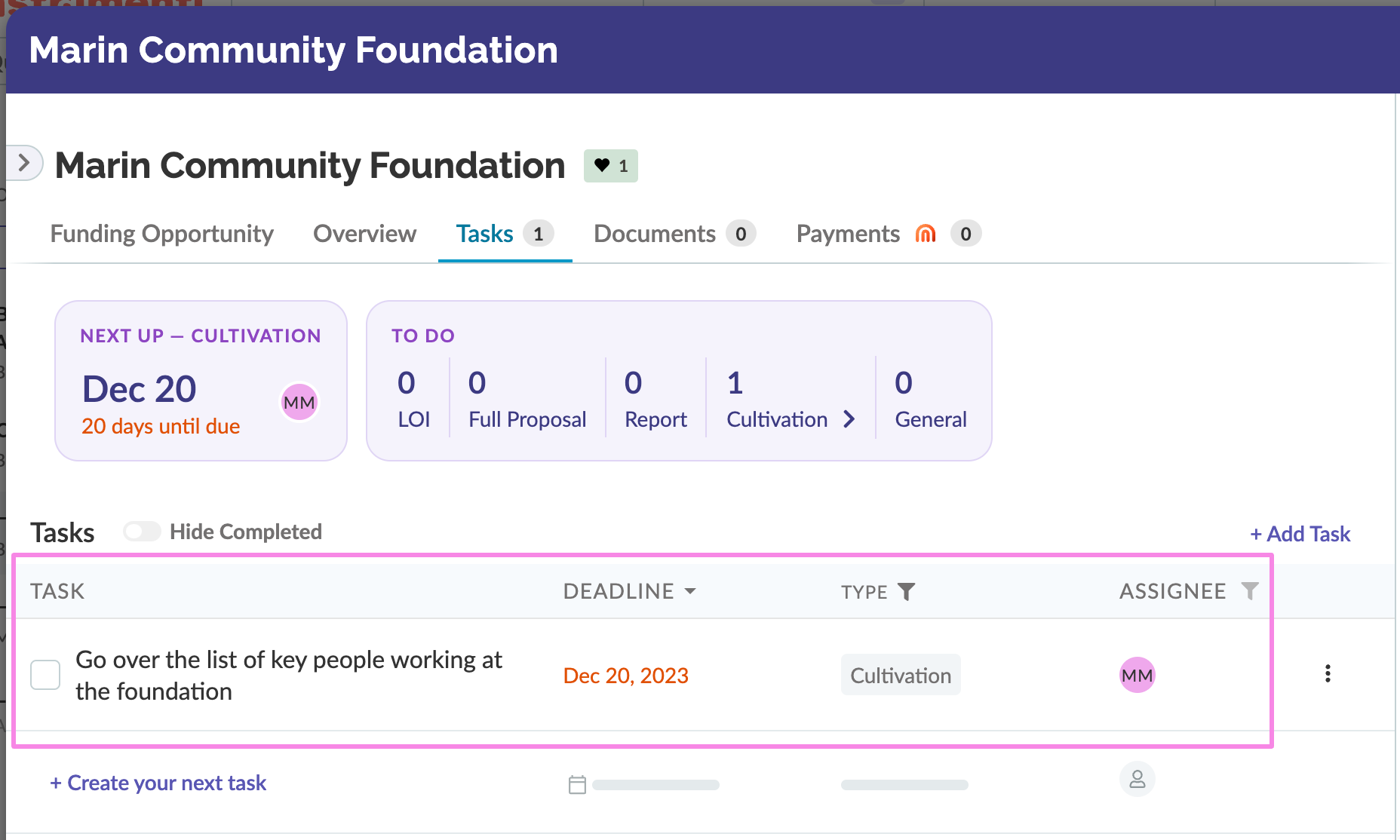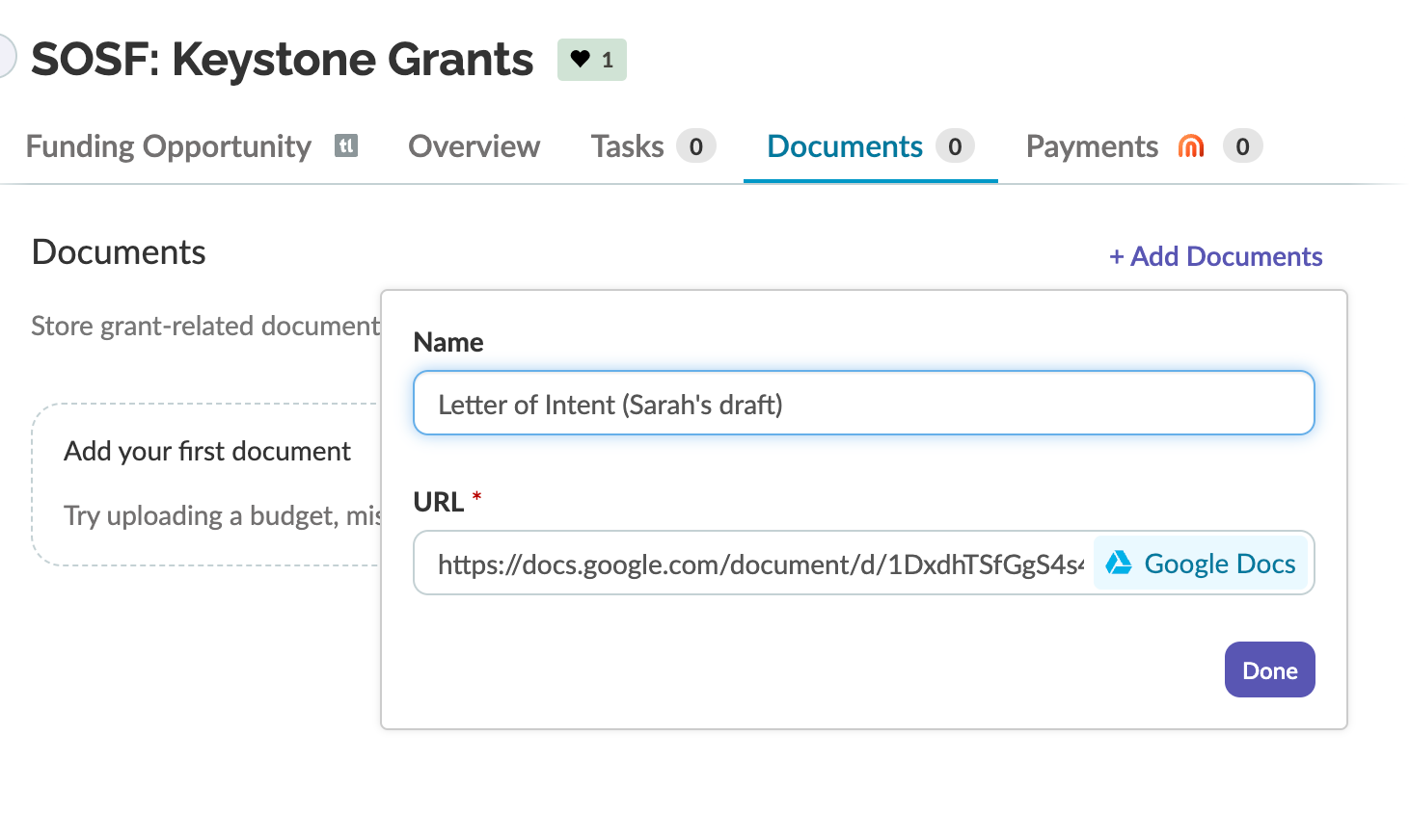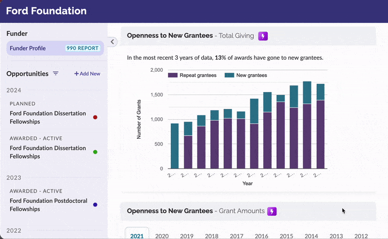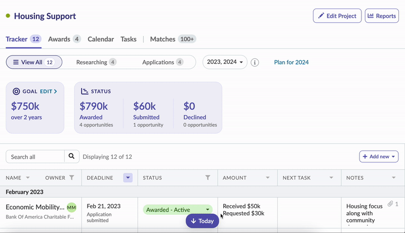 What we learned by talking to hundreds of grant professionals is that they use a spreadsheet to track when each payment will come in. However, this makes it hard to understand aggregate cash flow and to use that information year over year. Plus, it’s hard to share the spreadsheet with others (e.g. Programs folks) to keep them informed.
