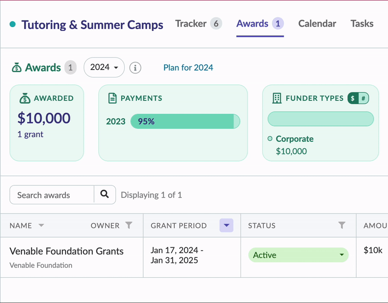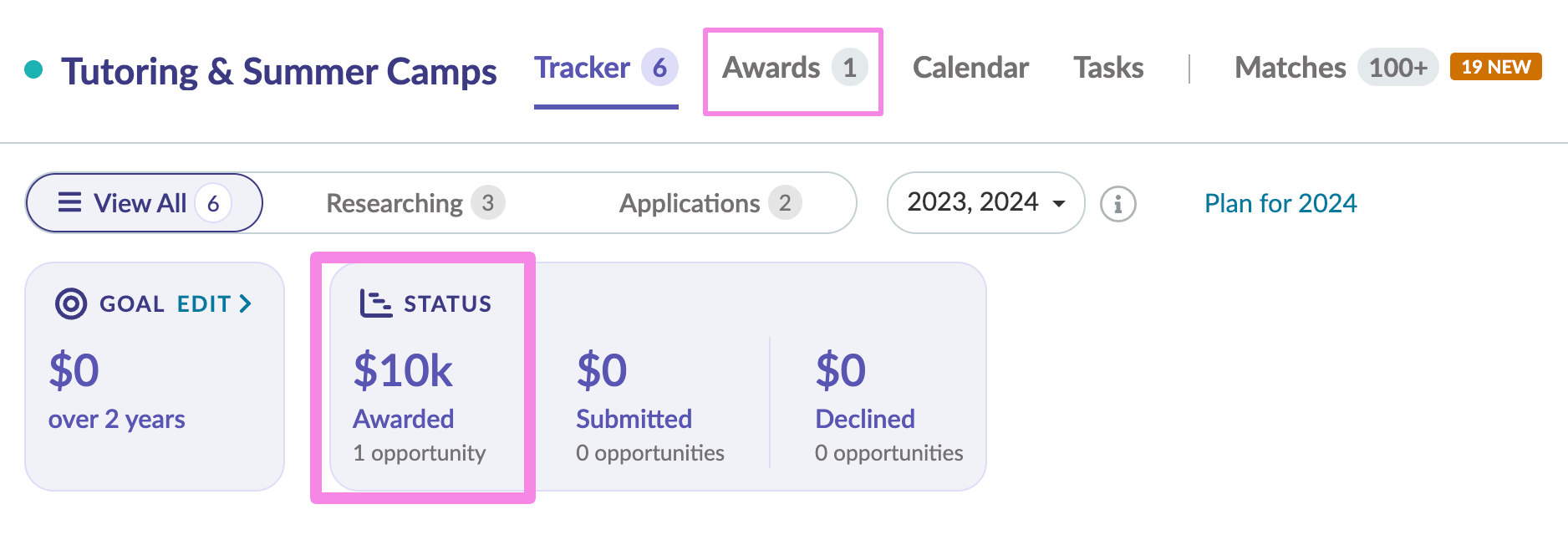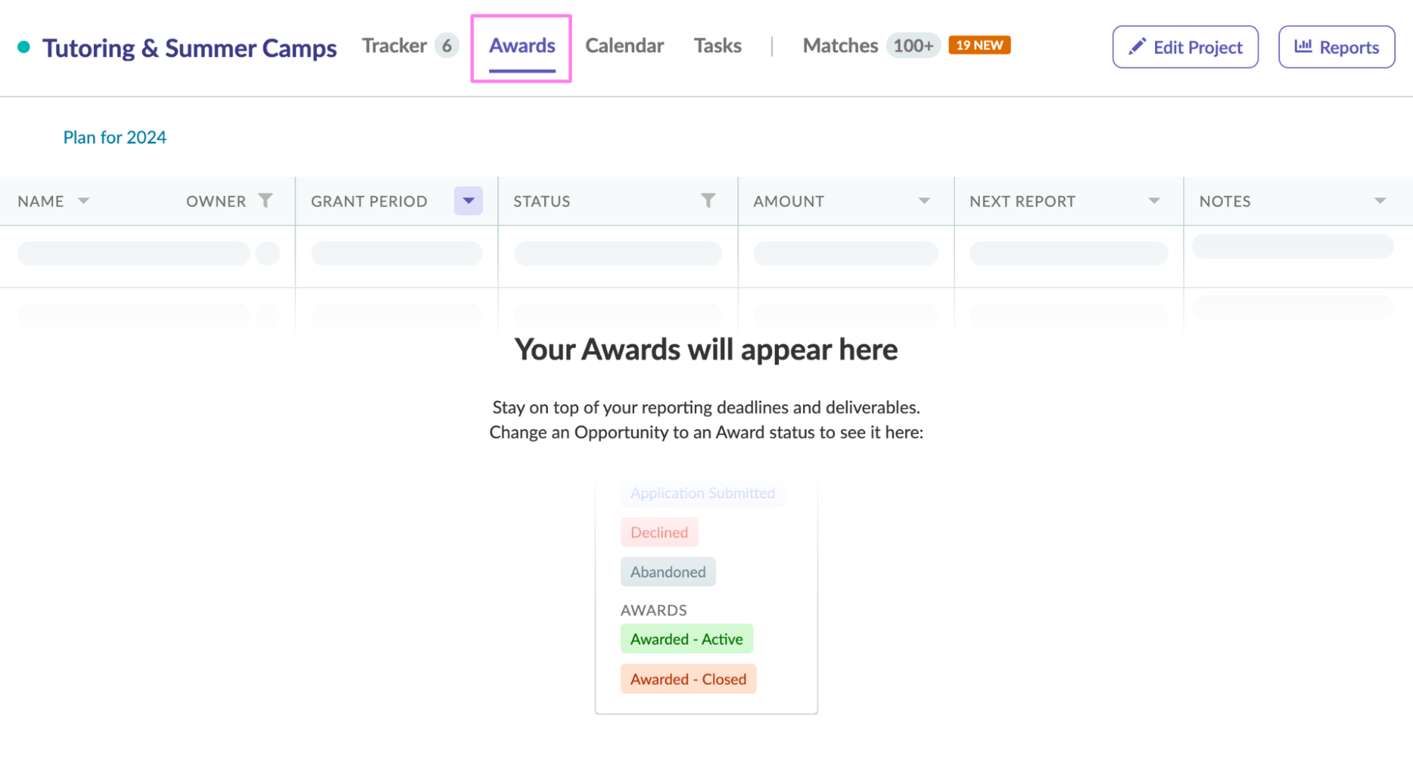 You’ll be able to see all of your awarded grants in one place by clicking into the Awards tab.