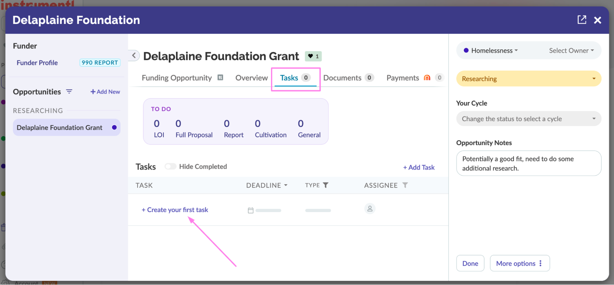 Once you sign up for your Instrumentl free trial and access the platform, you’ll be prompted to create your first project.