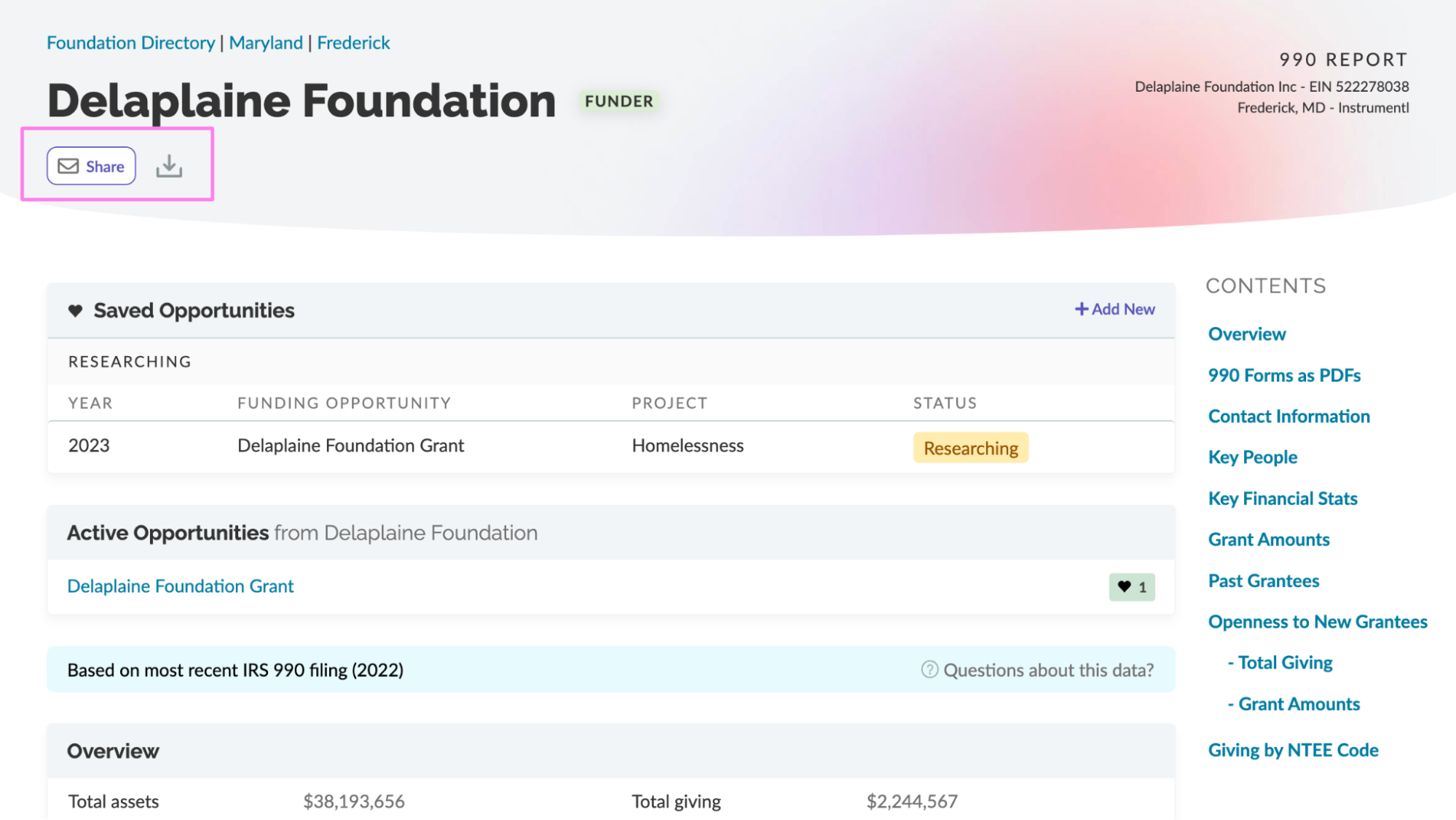 The best part is that all links within the PDF are clickable. Even people outside of Instrumentl can click on them and view the opportunities that live in your account. You can instantly share your grant progress with board members or other members of your organization.