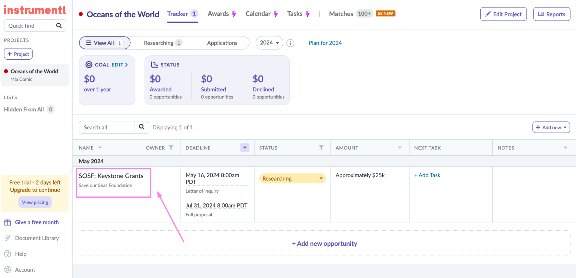 You’re almost done with your free trial! Now is the time to add a new project to your Instrumentl account and play around with it–freestyle.