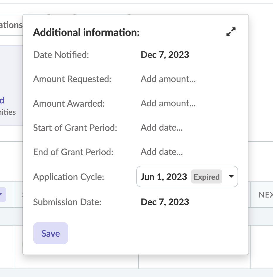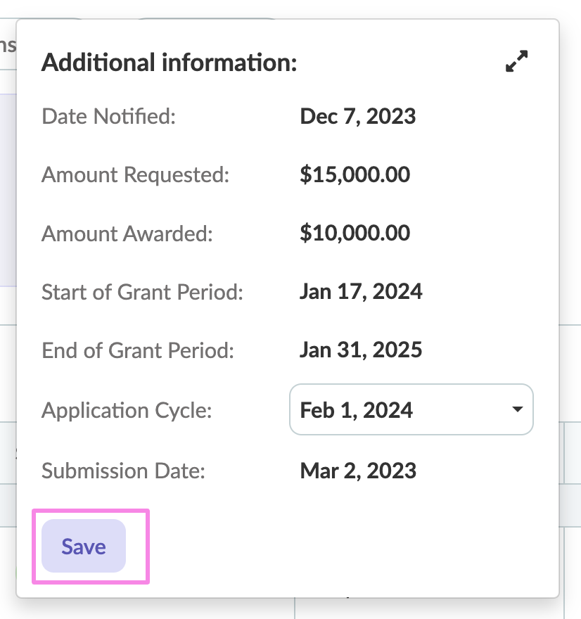 Once you change the status, you’ll get the opportunity to add more details about the awarded grant.