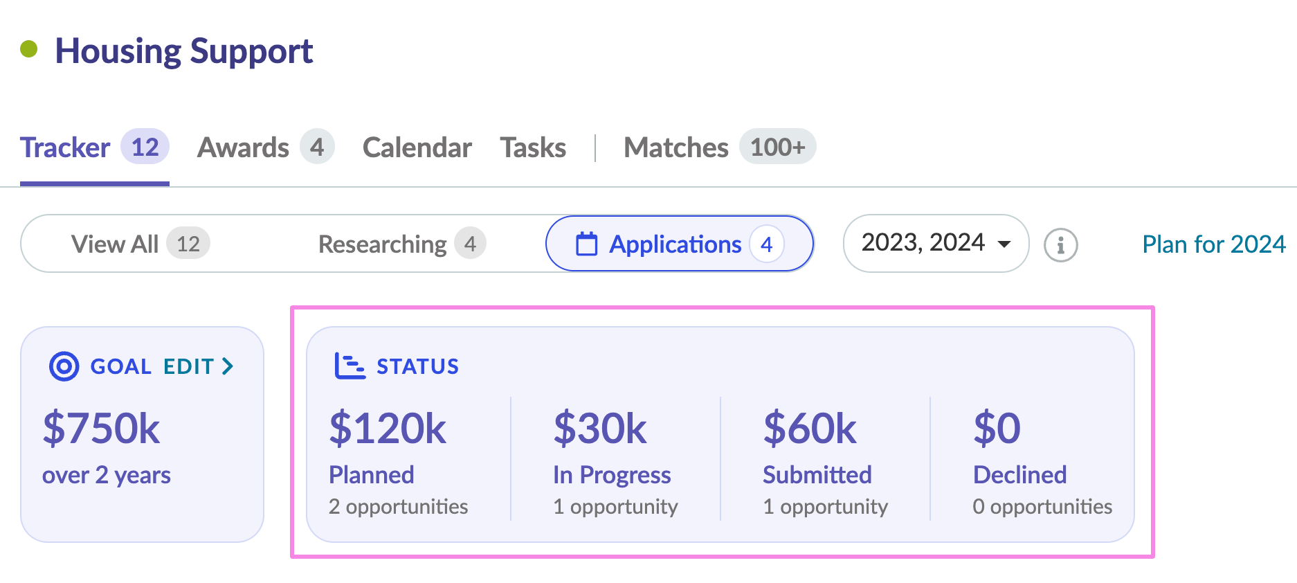 As you can see, in the Applications view, you can immediately grasp the current status of your grants, making it easier to see how far you are from reaching the goal.