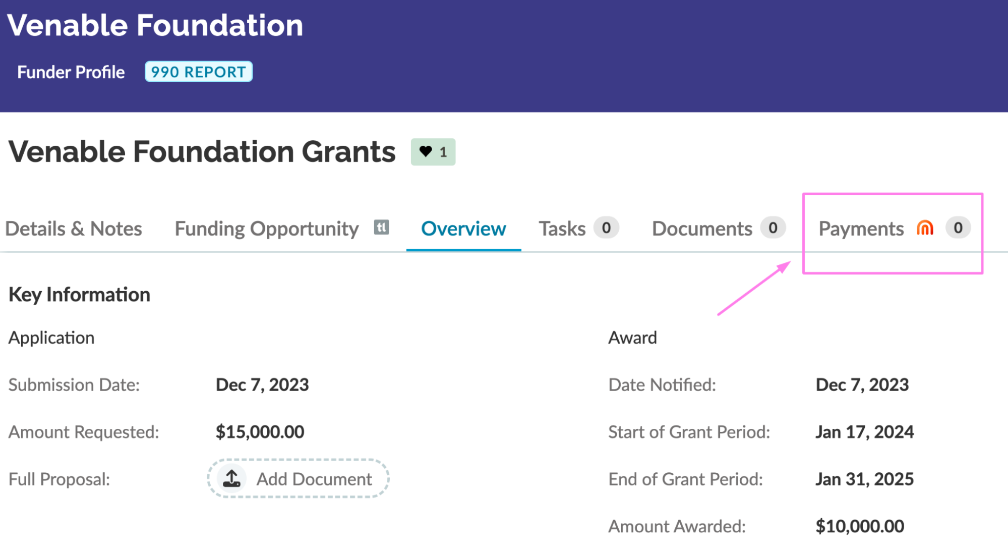 When you mark the date you received the payment, it will also be shown in the Payments Tracker within the Awards View. Let’s go and check.