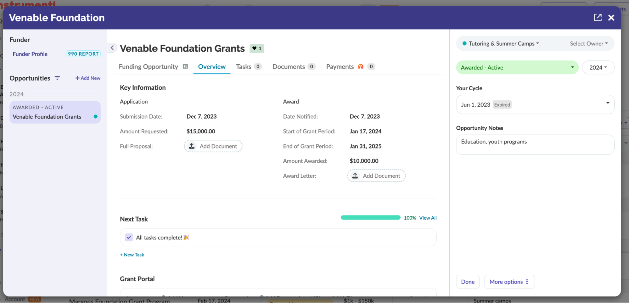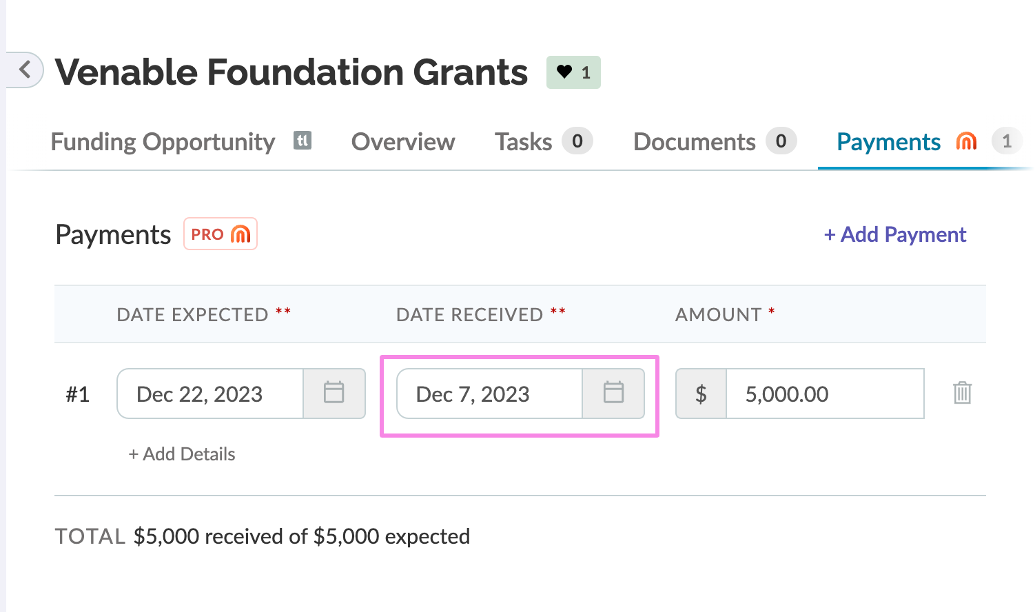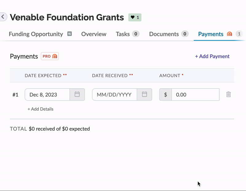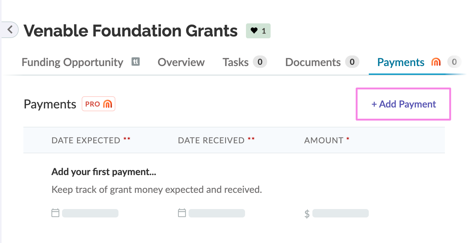 Instrumentl glossary: Payments Tracking empowers you to quickly visualize and monitor the inflow of funds for awarded grants, whether they arrive in installments or lump sums.