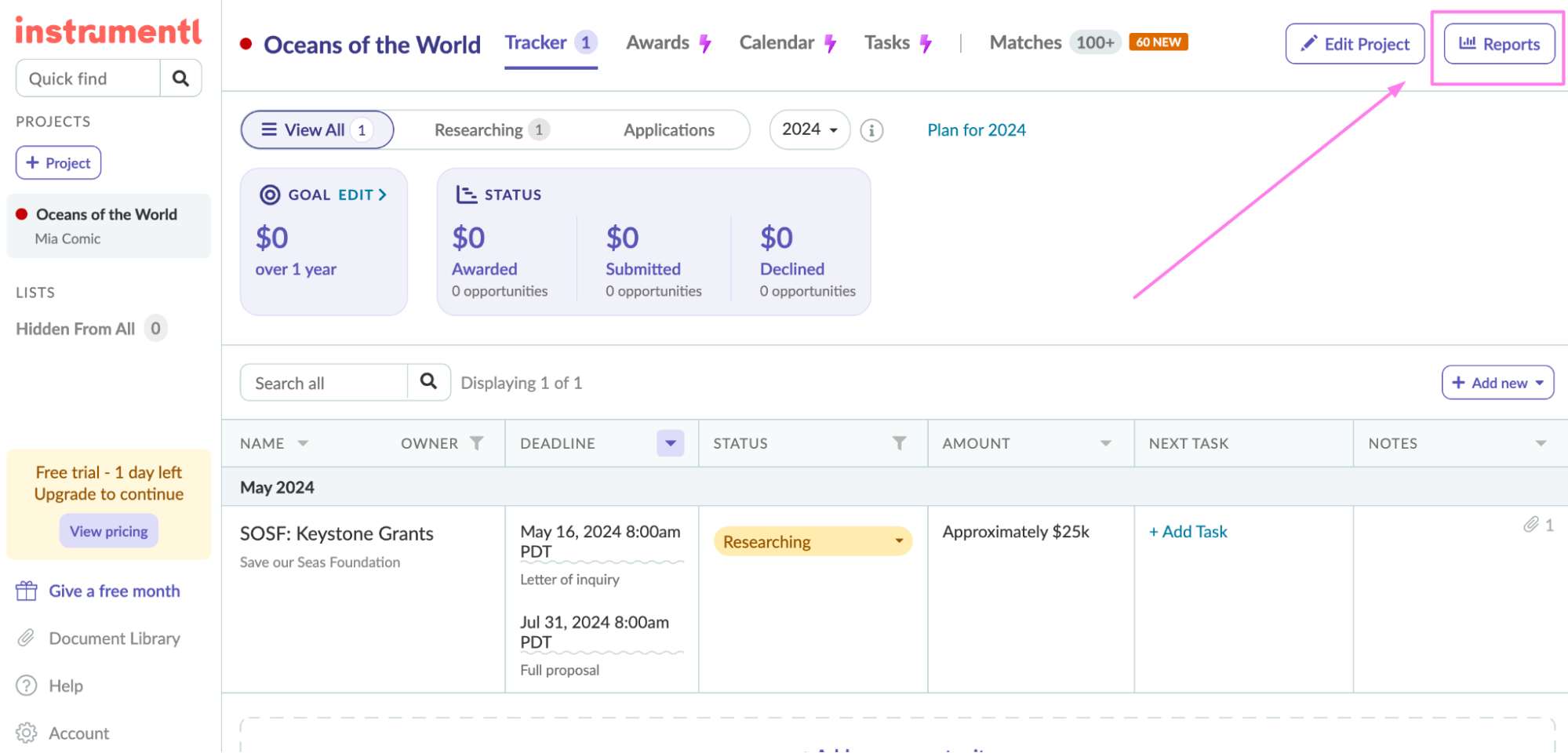 Instrumentl allows you to generate five different reports. You can access them by clickin on “Reports” from your Tracker. The button is located on the upper right side.