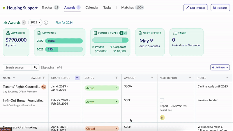 When you click on “Awards”, you’ll open the Awards View. This is a dedicated space for all your awarded grants (both active and closed).